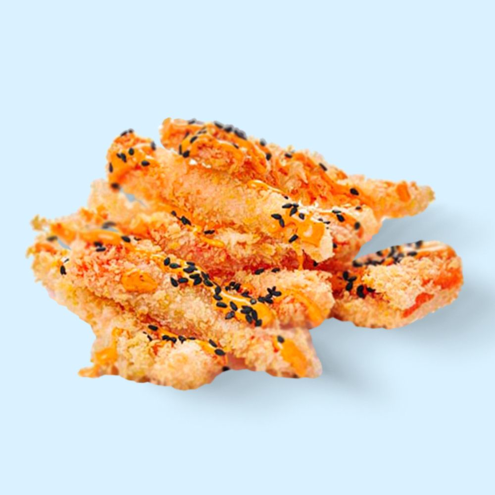 Лосось, яйцо, мука, соль, сухари панировочные, кунжут чёрный, майонез, паста кимчи, соус терияки